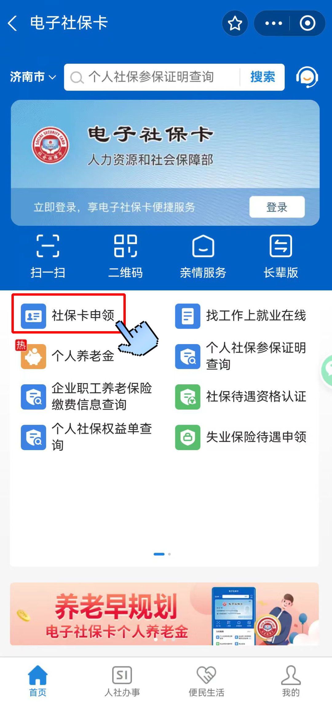 對于不在濟(jì)南的參保人,如因故無法前往現(xiàn)場辦理社??ǎ赏ㄟ^“支付寶”APP中的“電子社??ā毙〕绦?,利用“社??ㄉ觐I(lǐng)”功能進(jìn)行在線辦理。