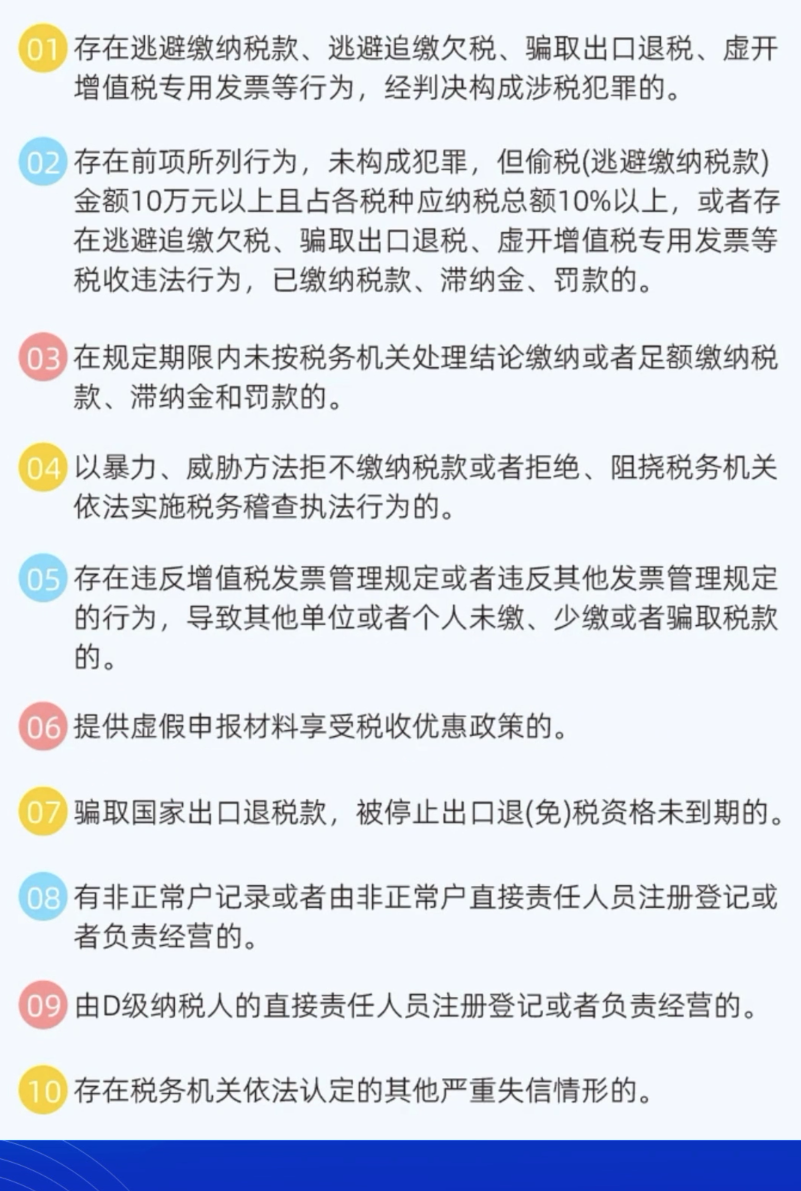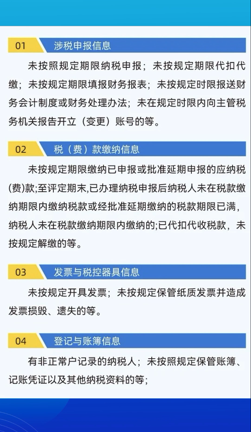 影響納稅信用評價的兩種 方式是什么? (一)通過年度評價指標得分方式 年度評價指標得分采取扣分方式,依據(jù)法律法規(guī)的相關(guān)規(guī)定,針對納稅人涉稅行為是否誠信、發(fā)生失信行為的態(tài)度和程度,設(shè)置不同的扣分標準。涉及處罰金額的,還會采取按百分比數(shù)值遞進方式,計算扣分值。以下扣分指標經(jīng)常出現(xiàn)但容易被忽視需要重點關(guān)注: 二、通過直接判級方式 直接判級的方式,即直接判定為D級納稅人的行為,適用于有嚴重失信行為的納稅人,如果您有以下情形,則會被直接判為D級納稅人。