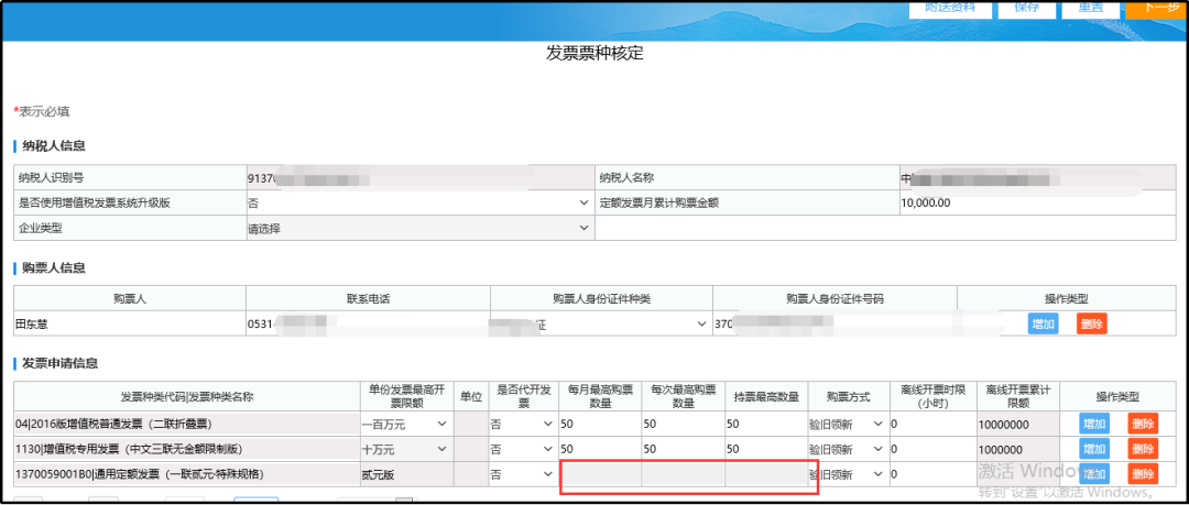 我單位辦理發(fā)票票種核定申請(qǐng)申請(qǐng)通用定額發(fā)票時(shí),頁(yè)面中“每月最高購(gòu)票數(shù)量”、 “每次最高購(gòu)票數(shù)量”、 “持票最高數(shù)量”這三項(xiàng)是灰色的無(wú)法操作怎么辦?