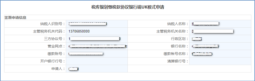 確認(rèn)申請(qǐng)信息(納稅人識(shí)別號(hào)、納稅人名稱、主管機(jī)關(guān)、三方協(xié)議號(hào)、銀行名稱、繳款賬號(hào)、繳款賬號(hào)名稱、申請(qǐng)人等信息),如下圖所示: