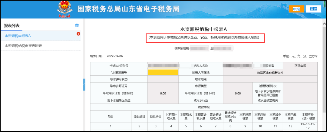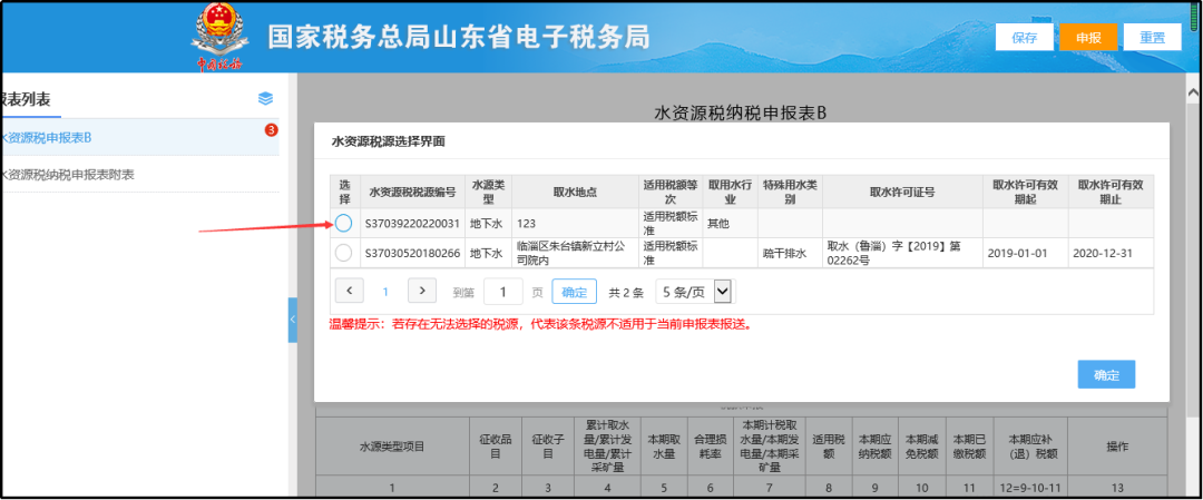 不能選擇是檢測(cè)到您單位不適用此類(lèi)報(bào)表,您可打開(kāi)水資源稅申報(bào)A表或B表,查看表頭下方報(bào)表適用范圍的說(shuō)明信息。
