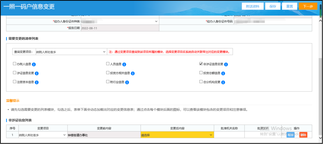 車(chē)船稅稅源明細(xì)表中的“車(chē)輛所處街鄉(xiāng)”,是根據(jù)納稅人登記信息中的“街道鄉(xiāng)鎮(zhèn)”項(xiàng)自動(dòng)帶出的,如發(fā)現(xiàn)不對(duì),請(qǐng)通過(guò)“一照一碼戶信息變更”(或兩證整合個(gè)體工商戶信息變更)模塊變更登記信息。