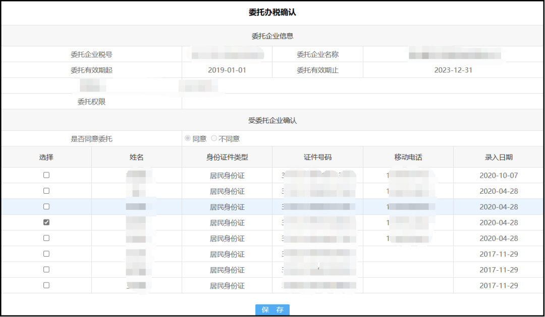 選中并“確認(rèn)”委托單位的辦稅申請,代理人同意委托單位申請并勾選辦理人員后,雙方確定代理關(guān)系。