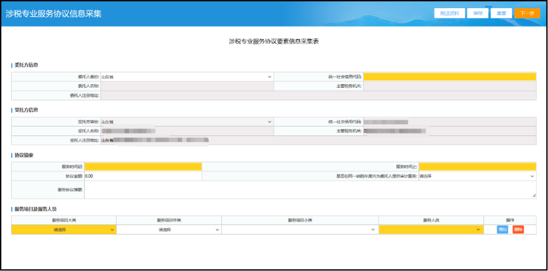您可通過電子稅務(wù)局“我要辦稅-涉稅專業(yè)服務(wù)機(jī)構(gòu)管理—涉稅專業(yè)服務(wù)業(yè)務(wù)信息采集-涉稅專業(yè)服務(wù)協(xié)議信息采集”模塊,采集委托方和受托方協(xié)議信息。