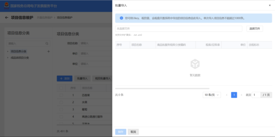 ②在主頁右側(cè)點擊“稅控批量導入”,進入稅控批量導入界面,如圖7所示,點擊“選擇文件”選擇稅控導出的文件進行導入,系統(tǒng)解析后將數(shù)據(jù)顯示在列表內(nèi),可自行調(diào)整列表的內(nèi)容。點擊“保存”,導入項目信息;點擊“取消”,取消導入操作。