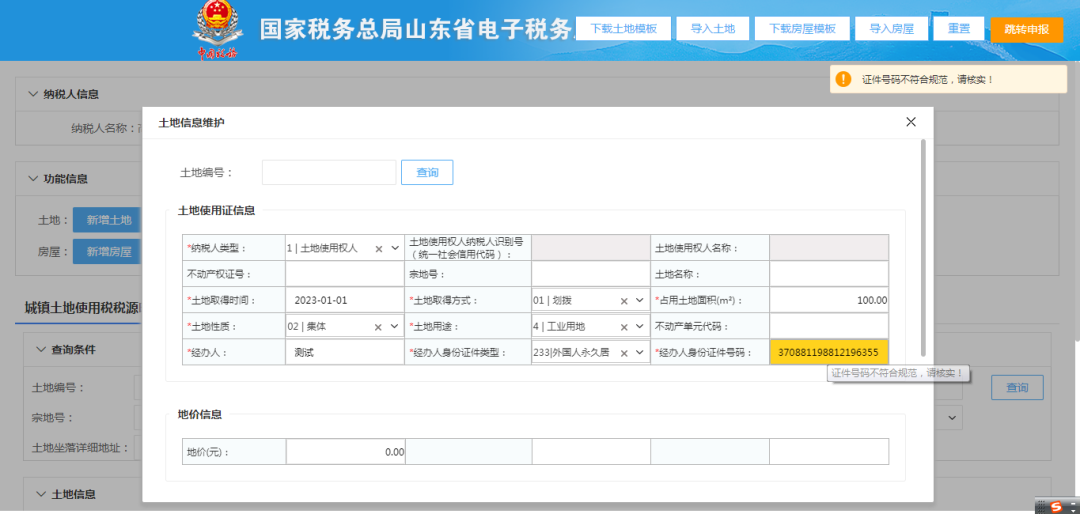 點(diǎn)擊“新增土地”或“新增房屋”,維護(hù)信息時(shí)身份證件類(lèi)型如選擇“233|外國(guó)人永久居留身份證”,身份證件號(hào)碼填寫(xiě)不符合規(guī)范,系統(tǒng)提示:證件號(hào)碼不符合規(guī)范,請(qǐng)核實(shí)!如下圖: