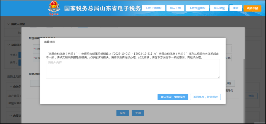 從價(jià)信息中填列了出租部分對(duì)應(yīng)的有效期起止與從租信息申報(bào)租金所屬租賃期起止不一致的,彈出提醒信息。如下圖: