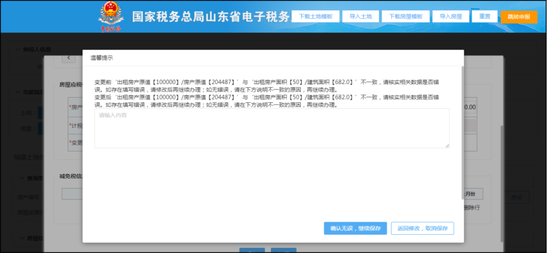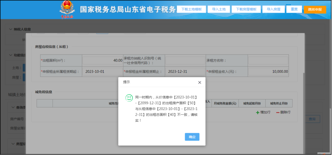 同一期間內(nèi)出租原值占房產(chǎn)原值之比與出租面積占房產(chǎn)面積之比不一致的,彈出提醒信息。如下圖: