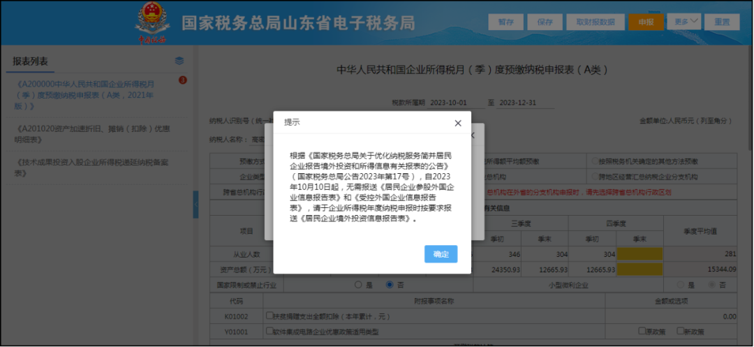 自稅款所屬期2023年第四季度(或12月)起,即稅款所屬期起為2023-10-01(按季度申報(bào))或2023-12-01(按月度申報(bào))起,取消報(bào)送《居民企業(yè)參股外國(guó)企業(yè)信息報(bào)告表》,系統(tǒng)不再帶出此表。