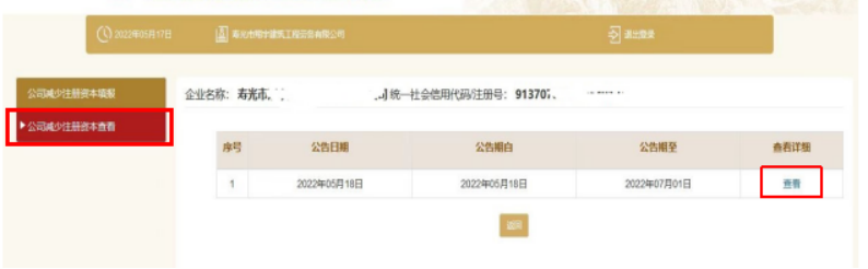 ④點(diǎn)擊頁面左側(cè)【公司減少注冊(cè)資本查看】,可以查看/打印減資信息。