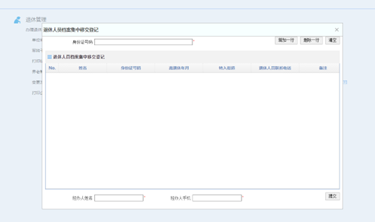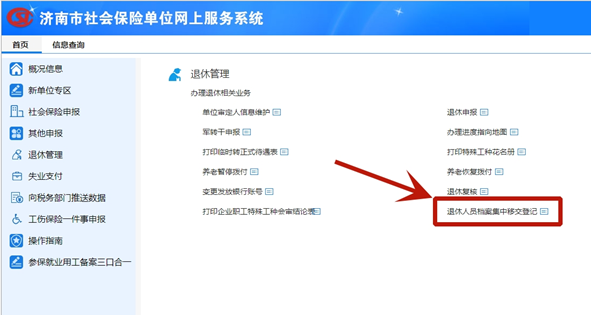服務(wù)范圍: 退休人員檔案集中移交登記功能目前服務(wù)范圍包括在市直及六區(qū)參保的企業(yè),以及市內(nèi)六區(qū)所屬的街鎮(zhèn)便民服務(wù)中心。 操作流程: 登錄官網(wǎng)的單位網(wǎng)上服務(wù)系統(tǒng): 打開(kāi)濟(jì)南市社會(huì)保險(xiǎn)事業(yè)中心官網(wǎng)(網(wǎng)址:http://jnhrss.jinan.gov.cn/col/col40152),點(diǎn)擊【單位網(wǎng)上服務(wù)系統(tǒng)】,進(jìn)入登錄界面。 (點(diǎn)擊圖片可放大查看) 登錄單位賬號(hào): (點(diǎn)擊圖片可放大查看) 選擇【退休管理】功能: (點(diǎn)擊圖片可放大查看) 點(diǎn)擊【退休人員檔案集中移交登記】: (點(diǎn)擊圖片可放大查看) 進(jìn)行登記操作: 輸入需集中移交檔案人員的身份證號(hào)碼,點(diǎn)擊【增加一行】(可重復(fù)添加多個(gè)退休人員信息);如需刪除信息可選中此行,點(diǎn)擊【刪除一行】。 填入經(jīng)辦人姓名、經(jīng)辦人手機(jī)號(hào),點(diǎn)擊【提交】即可完成操作。 (點(diǎn)擊圖片可放大查看) 注意事項(xiàng): 企業(yè)要整理退休人員基本信息,按時(shí)在系統(tǒng)內(nèi)完成登記。為保證檔案順利移交,請(qǐng)各企業(yè)于每季度末15日之前做好退休人員檔案移交登記工作。 企業(yè)退休人員檔案集中移交工作是減輕企業(yè)負(fù)擔(dān),提高工作效率的有效措施。濟(jì)南市社保中心進(jìn)一步規(guī)范檔案集中移交流程,上線(xiàn)了企業(yè)退休人員檔案集中移交登記功能。企業(yè)可通過(guò)此功能將本季度退休人員信息提前錄入系統(tǒng),各分中心和街道便民服務(wù)中心可隨時(shí)查詢(xún)本轄區(qū)的移交人員信息,以便在每季度線(xiàn)下集中移交時(shí)做到心中有數(shù)、確無(wú)遺漏。 該功能通過(guò)先登記、再查詢(xún)的工作機(jī)制,破除了企業(yè)與街道間的信息壁壘,讓企業(yè)少跑腿,讓服務(wù)多到位,真正實(shí)現(xiàn)了企業(yè)與街道便民服務(wù)中心的精準(zhǔn)對(duì)接和雙向減負(fù)。